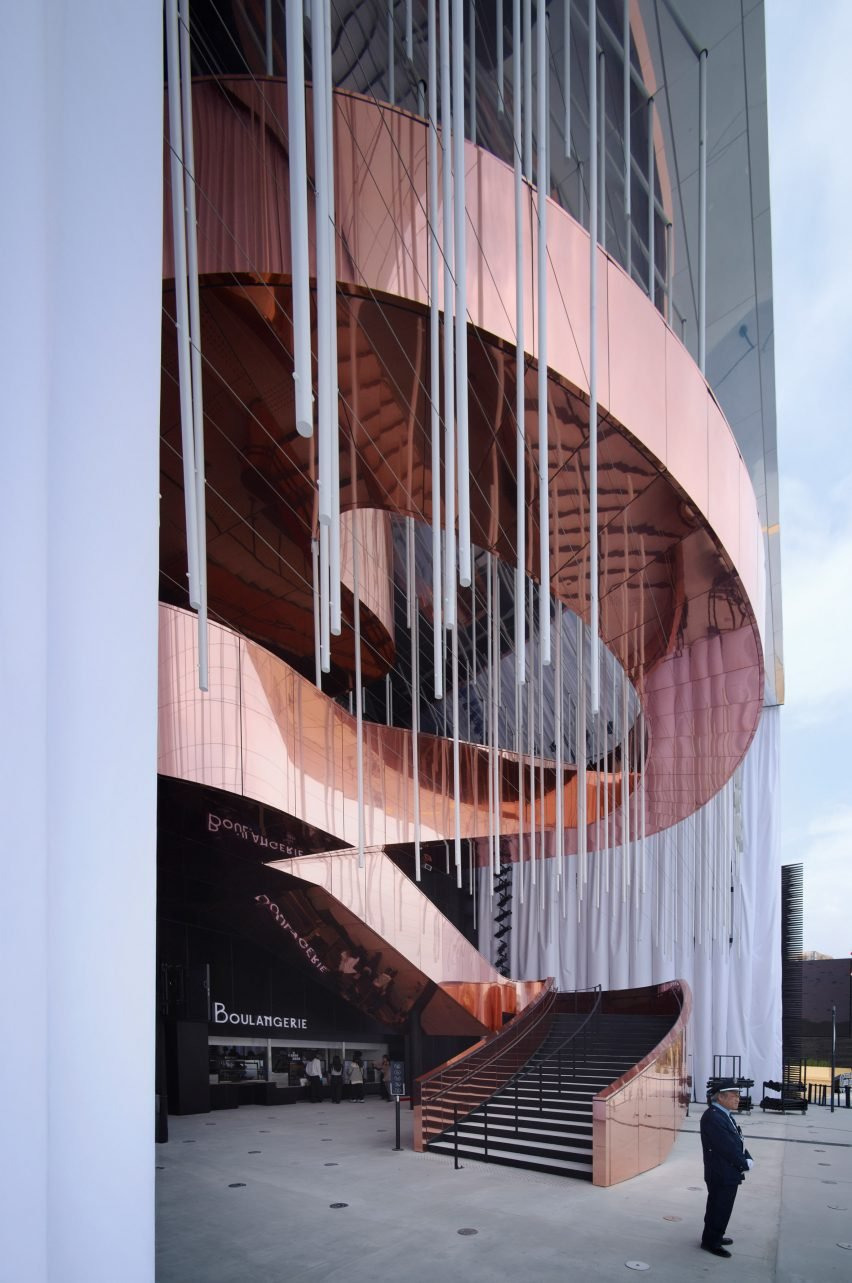 프랑스관의 가장 인상적인 요소는 외관을 감싸며 위로 솟는 대형 나선형 계단입니다. 이 계단은 일본 전설인 아카이 이토, 즉 운명의 붉은 실을 모티프로 하여 설계되었으며, 극장의 웅장한 계단을 연상시키는 조형적 역할도 수행합니다. 관람객들은 이 계단을 따라 건물 꼭대기로 올라갔다가 다시 내려오며 전시를 감상하게 됩니다. 설계자 토마 콜드피는 이 계단이 단순한 구조물이 아니라 건축적 서사의 중심이자 무대 그 자체라고 설명합니다. 방문객은 공간을 바라보는 이에서 공간을 구성하는 주체로 전환됩니다.