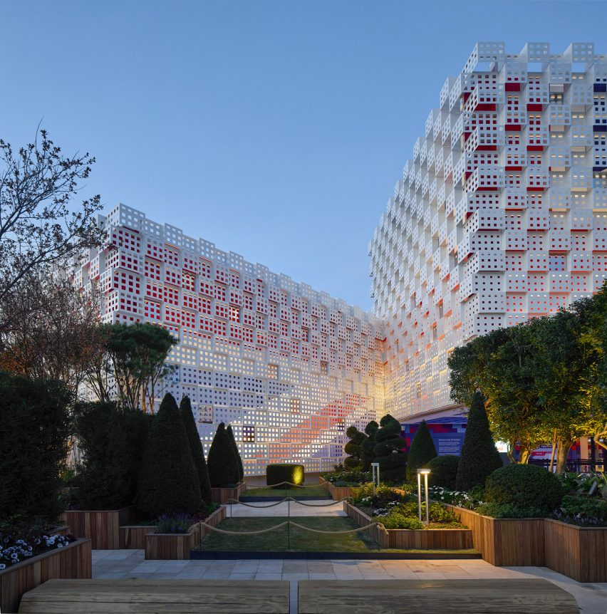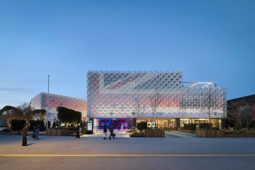 런던의 건축사무소 우 아키텍츠(Woo Architects)가 설계한 2025 오사카 엑스포(Expo 2025 Osaka) 영국관은 산업혁명기 직조 기계에서 사용된 천공카드를 모티프로 한 외관이 인상적입니다. 14미터 높이의 임시 구조물은 파우더 코팅 처리된 알루미늄 패널이 접혀 만들어진 3D 격자형 패턴으로 감싸져 있으며, 이 금속 표면에는 네모난 천공이 반복되어 디지털 시대의 픽셀을 연상시킵니다. 이러한 패널 디자인은 영국과 일본의 섬유 산업이 만들어낸 혁신 유산을 기념하며, 과거와 현재를 잇는 상징적 요소로 작용합니다.