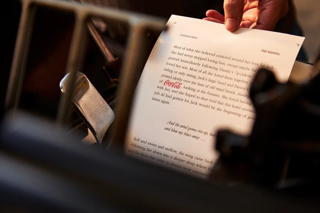 클래식 문학 속에서 발견된 코카콜라(Coca-Cola)의 이름이 독특한 광고 캠페인을 통해 새롭게 재조명됩니다. 코카콜라가 최근 스페인과 영국에서 진행한 '클래식(Classic)' 캠페인은 고전 작품 속에 등장하는 브랜드의 이름을 당시 초판본 서체 그대로 표현하며 색다른 접근 방식을 선보였습니다. 스티븐 킹(Stephen King)의 『샤이닝(The Shining)』을 비롯해 J. G. 발라드(J. G. Ballard)의 『극단적 은유(Extreme Metaphors)』, V. S. 나이폴(V. S. Naipaul)의 『비스와스 씨를 위한 집(A House for Mr. Biswas)』에 등장한 ‘코카콜라’라는 단어가 브랜드 특유의 빨간색 로고 형태로 강조된 것입니다. 이 방식은 오래된 종이 위에 검은색의 고전적 타이포그래피와 어우러져 브랜드의 존재감을 강렬히 드러냅니다. 광고 영상의 도입부에 등장하는 타자기가 문장을 완성해가다가 갑자기 ‘코카콜라’라는 단어가 빨간색 로고로 나타나는 순간은 시각적 즐거움을 더합니다.