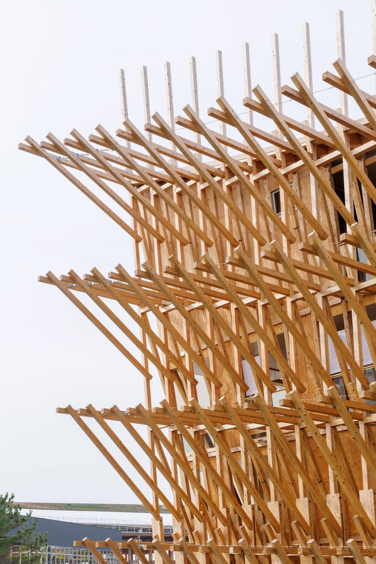 바레인 파빌리온의 가장 큰 특징 중 하나는 바로 둥글게 솟아오른 지붕 디자인입니다. 가운데가 살짝 내려가고 양쪽 끝이 위로 올라간 이 형태는 전통적인 도우 배의 우아한 선형을 현대적으로 해석한 것입니다. 외벽은 목재 골조가 격자 형태로 돌출되어 마치 바다 위의 물결을 따라 움직이는 배의 지지대처럼 보이게 만들었습니다. 정면은 반투명한 소재로 덮여 있어, 도우 배의 돛을 상징적으로 표현했습니다. 고트메는 "이러한 소재를 선택한 이유는 파빌리온의 경쾌한 느낌과 통풍이 잘 되는 환경을 조성해, 수동적인 기후 제어 효과까지 고려한 것"이라고 설명했습니다.