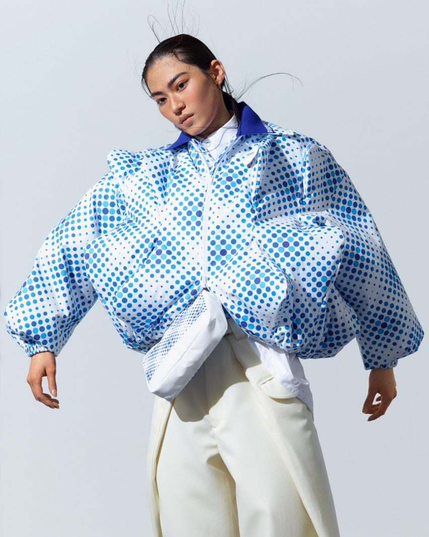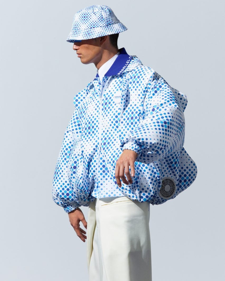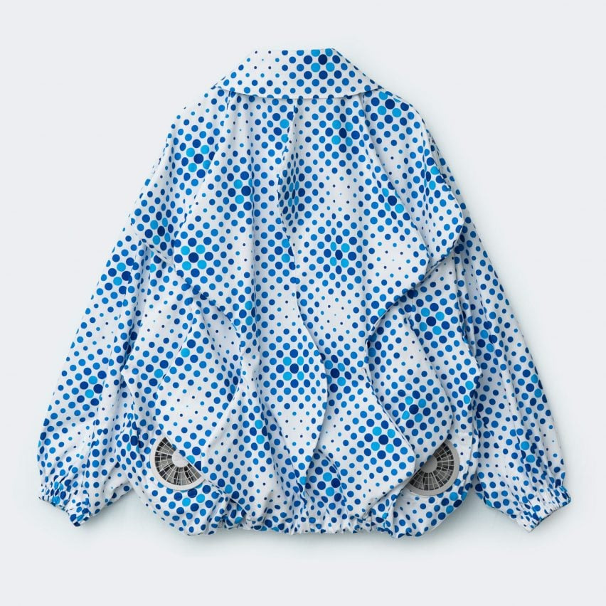 유니폼 컬렉션의 핵심은 전기 팬이 장착된 특수 재킷으로, 몸과 옷 사이에 공기를 순환시켜 착용자의 체온을 낮춰주는 구조입니다. 이 팬은 소니(Sony)의 전 엔지니어 이치가야 히로시(Hiroshi Ichigaya)가 설립한 에어컨 의류 제조업체 쿠초후쿠(Kuchofuku)와 협력하여 제작됐습니다. 배터리로 작동하는 이 팬은 상체 주위의 공기를 순환시키며, 땀의 증발을 이용해 몸을 식힌 후 옷깃과 소매를 통해 공기를 방출합니다. 이를 통해 외부 온도가 높더라도 쾌적함을 유지할 수 있습니다. 모리나가는 재킷이 만들어내는 풍성한 실루엣이 "구름과 같은 형태를 띠며 기술이 사람들을 연결하고 경계를 초월하는 모습을 상징한다"고 설명했습니다.
