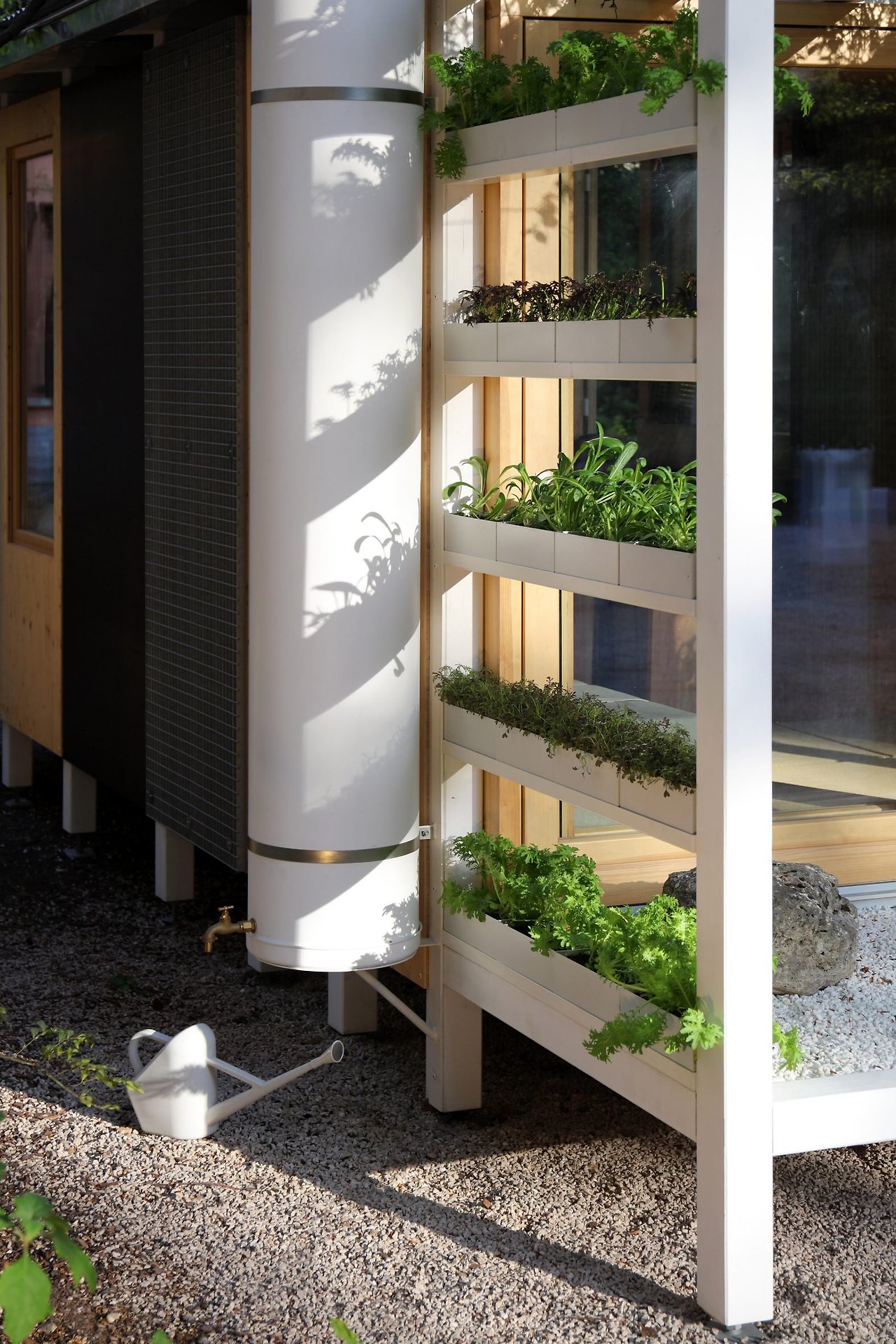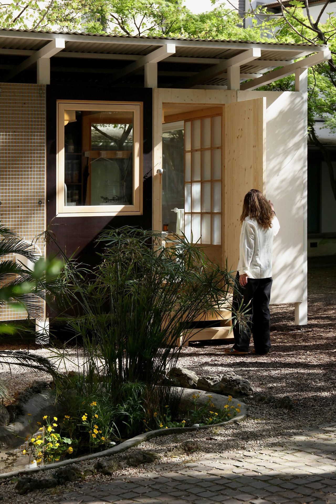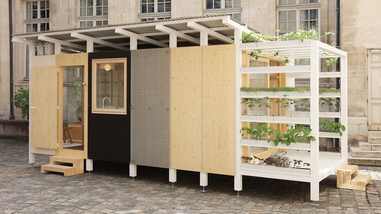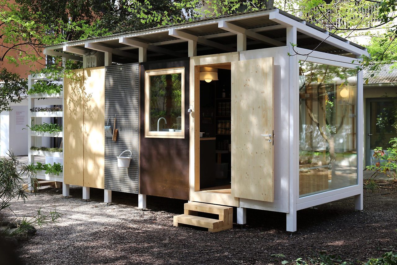 이 집은 밀라노 브레라 지역의 안뜰에 설치되었으며, 각 모듈은 용도에 따라 다른 크기로 구성되어 있습니다. 일본식 목욕통이 있는 욕실, 신발 수납 기능을 갖춘 현관, 조리대와 벽걸이 선반이 있는 주방, 다이닝 겸 작업 공간, 다다미와 쿠션이 있는 침실, 식물을 키울 수 있는 수직 정원 등으로 구성됩니다. 벽은 재활용 섬유 블록으로 단열되며, 지붕은 빛 반사와 빗물 수집 기능을 갖췄습니다.