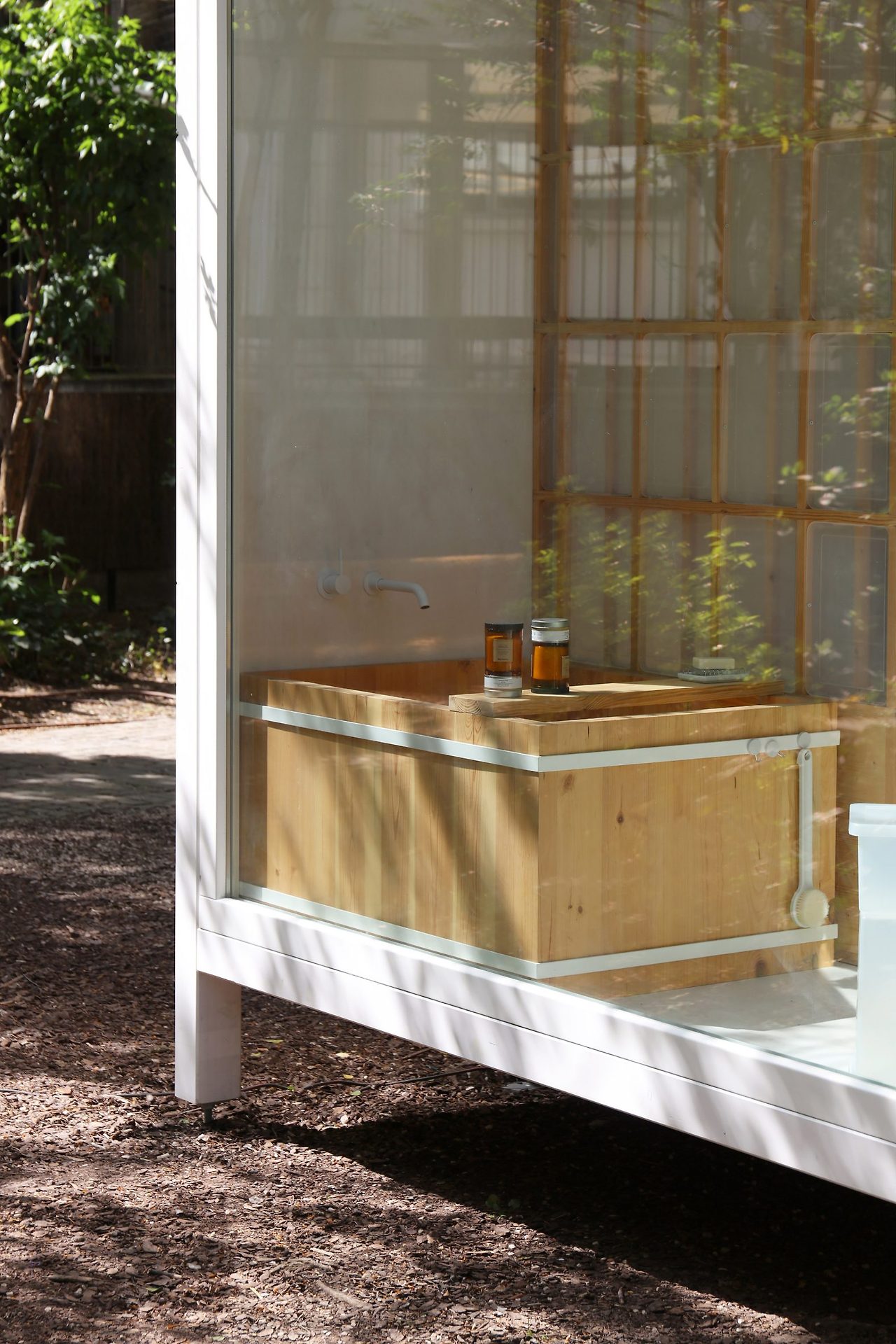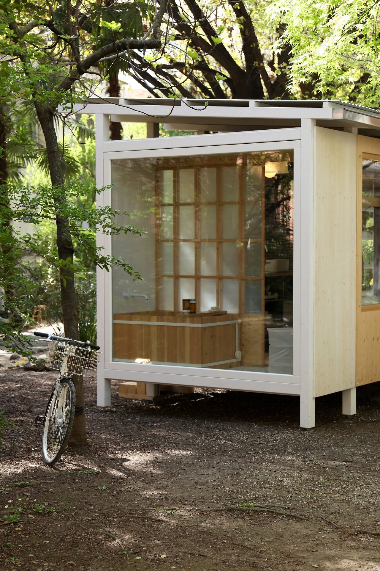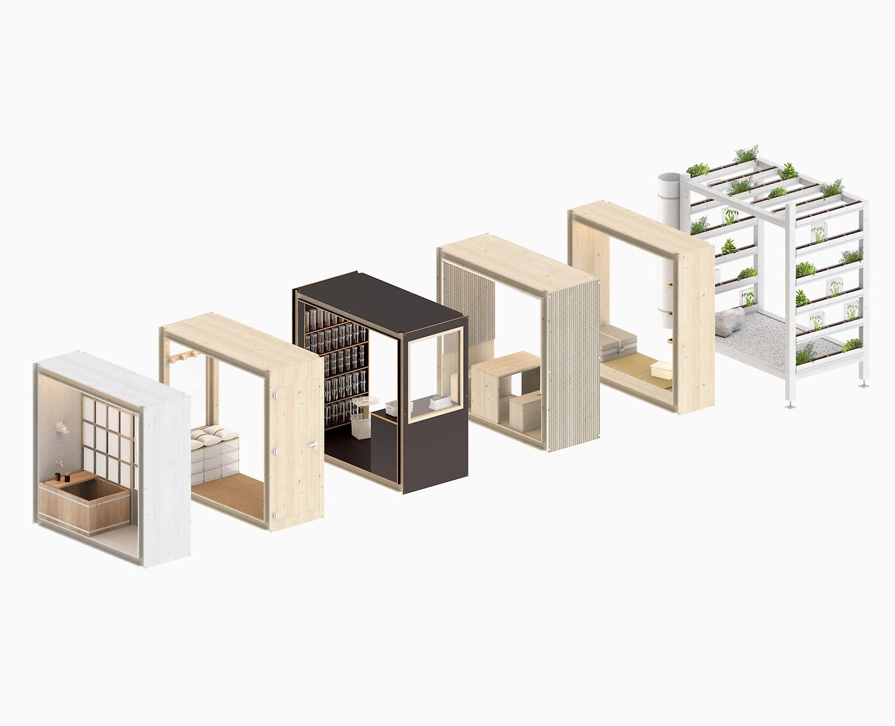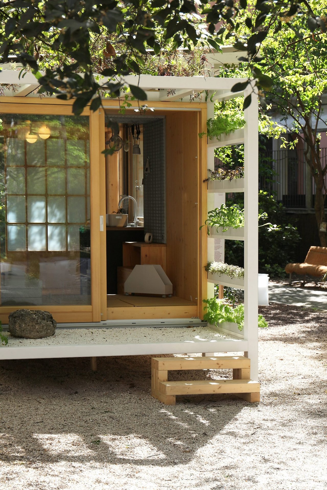 이 집은 밀라노 브레라 지역의 안뜰에 설치되었으며, 각 모듈은 용도에 따라 다른 크기로 구성되어 있습니다. 일본식 목욕통이 있는 욕실, 신발 수납 기능을 갖춘 현관, 조리대와 벽걸이 선반이 있는 주방, 다이닝 겸 작업 공간, 다다미와 쿠션이 있는 침실, 식물을 키울 수 있는 수직 정원 등으로 구성됩니다. 벽은 재활용 섬유 블록으로 단열되며, 지붕은 빛 반사와 빗물 수집 기능을 갖췄습니다.
