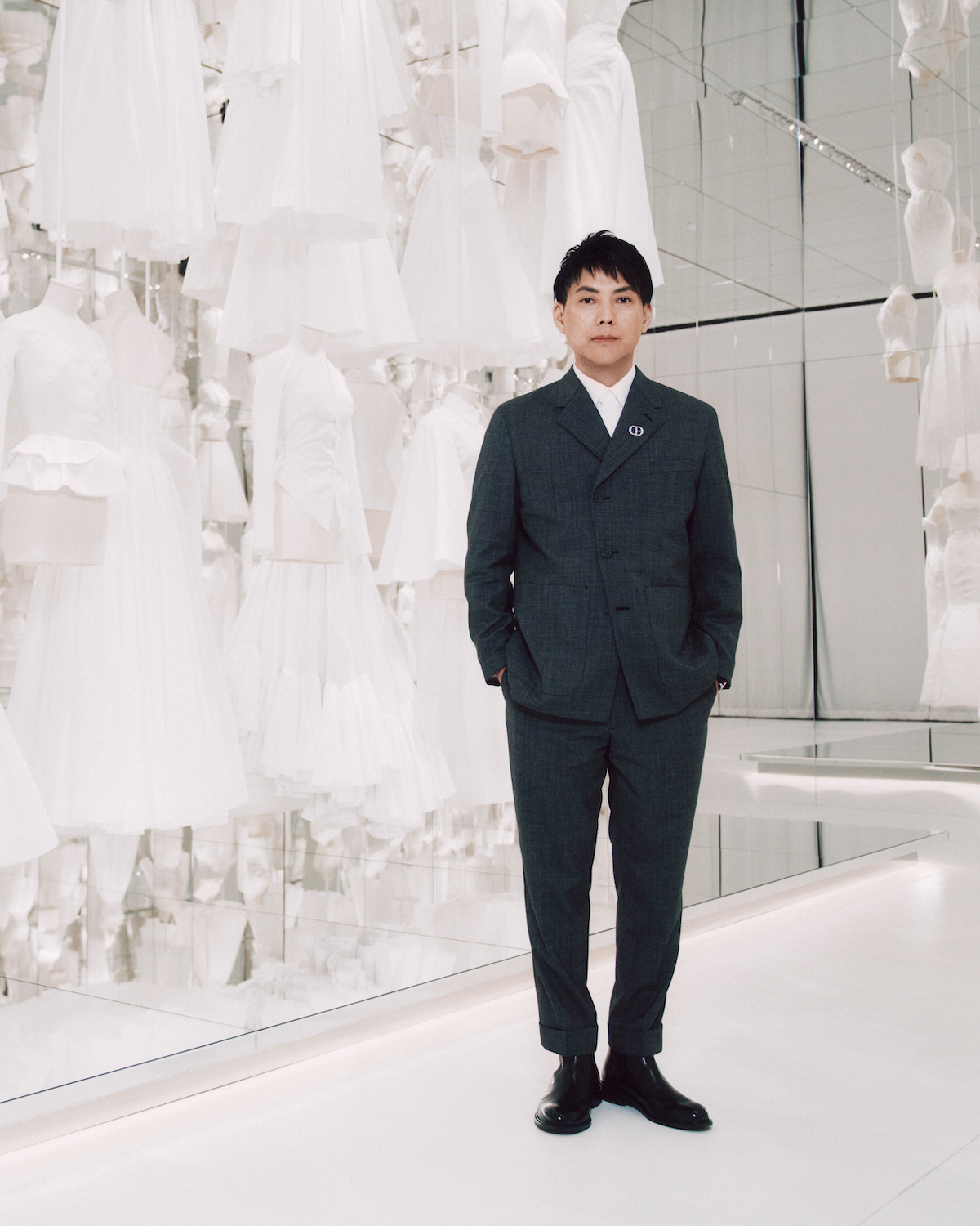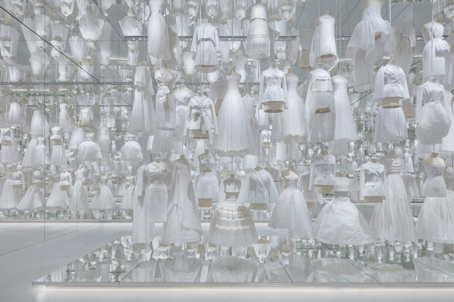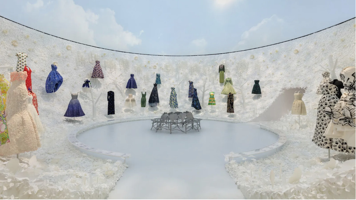 총 2,000제곱미터에 이르는 기둥 없는 전시 공간을 활용해 시게마츠는 주제별 장면으로 구성된 일련의 공간을 연출했습니다. 전통 한복 천과 보자기 패턴은 동서양의 대화를 암시하며, 디올의 역사와 현대성이 부드럽게 교차합니다. 각 방은 의상 실루엣에서 영감을 받은 형태와 텍스처로 구성되며, 예를 들어 '디올 가든' 공간에서는 조명이 계절과 시간에 따라 변하며 천장에 투영되고, 그 아래 드레스들은 식물처럼 전시되어 몽환적인 분위기를 자아냅니다.
