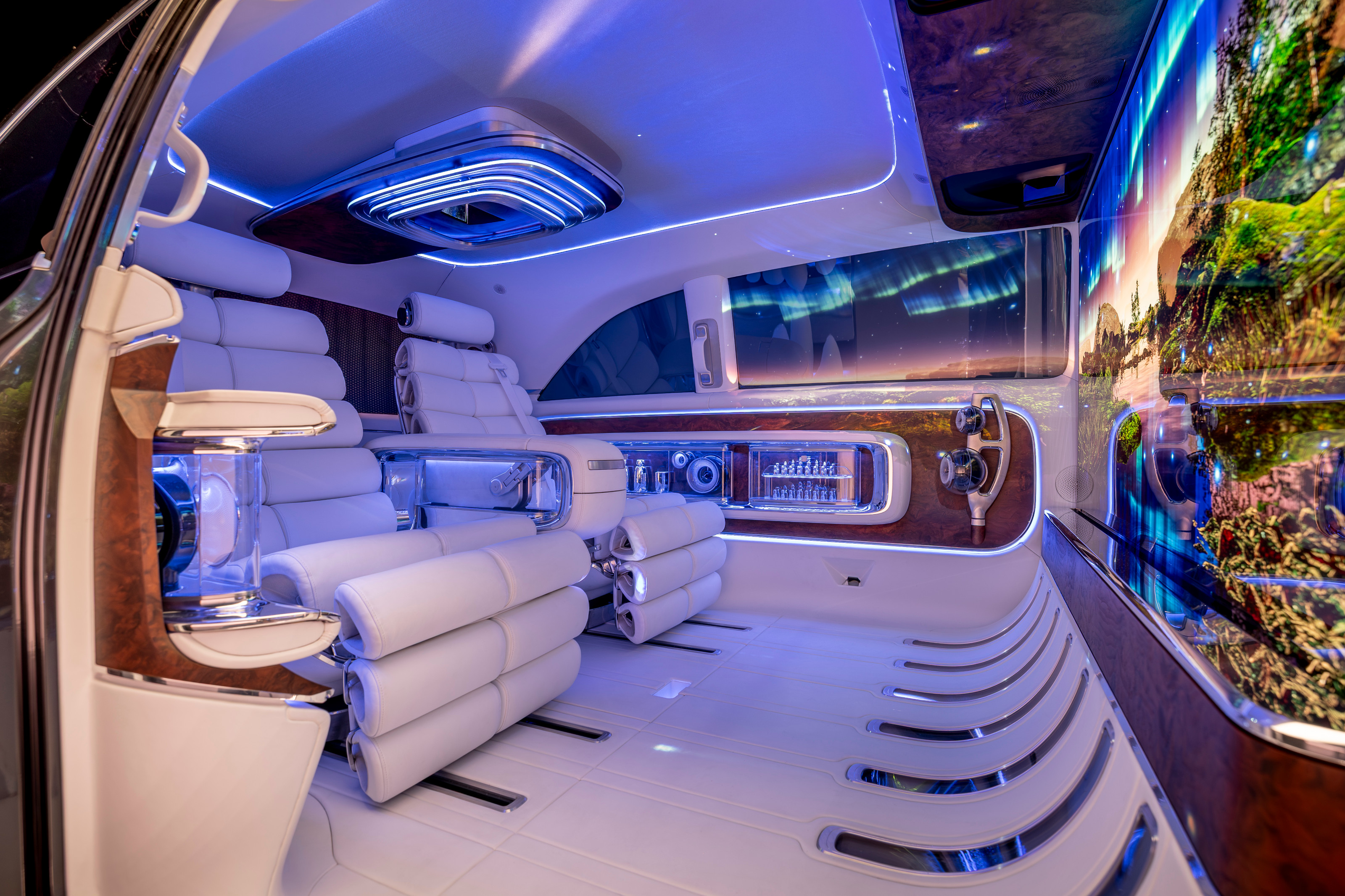 비전 V의 또 다른 핵심은 ‘빛’입니다. 차량 내부 곳곳은 숨겨진 LED 조명으로 구성되어 있으며, 마치 아르데코 극장을 연상케 하는 중앙 조명 장식과 문 안쪽에 배치된 백라이트 캐비닛은 고급스러움의 정점을 보여줍니다. 이 캐비닛에는 투명 스피커, 전용 가방, 체스 세트까지 담겨 있어 진정한 ‘움직이는 럭셔리 라운지’를 실현합니다.