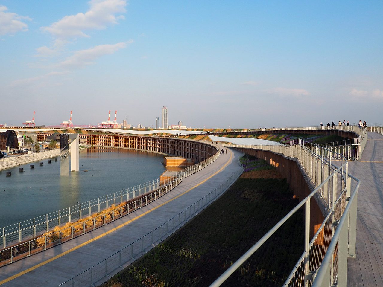 '그랜드 링' 위에는 높이 12미터의 '링 스카이워크(Ring Skywalk)'가 설치되어 있습니다. 에스컬레이터와 엘리베이터를 통해 접근할 수 있으며, 상하층으로 구성된 이 공간에서는 오사카 시내와 오사카 만, 그리고 엑스포 부지를 조망할 수 있습니다. 주요 동선 역할을 하는 동시에 방문객들에게 경관을 즐길 수 있는 특별한 경험을 제공합니다.