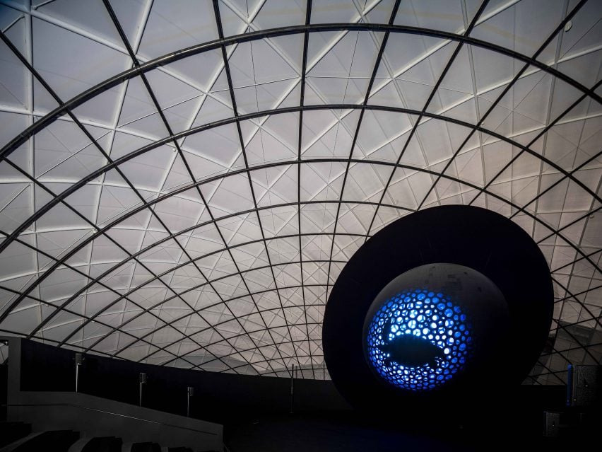 블루 오션 돔 내부에는 인간 활동으로 오염되고 있는 바다의 가치를 강조하는 전시가 마련되어 있습니다. 무지(Muji)의 아트 디렉터로 잘 알려진 디자이너 하라 켄야(Kenya Hara)가 전시 연출을 맡아, 돔 A와 돔 B 내부에 360도 영상 투영을 포함한 다양한 전시를 구성했습니다. 블루 오션 돔은 오사카 엑스포를 대표하는 10개의 주목할 만한 구조물 중 하나로 선정되었습니다.