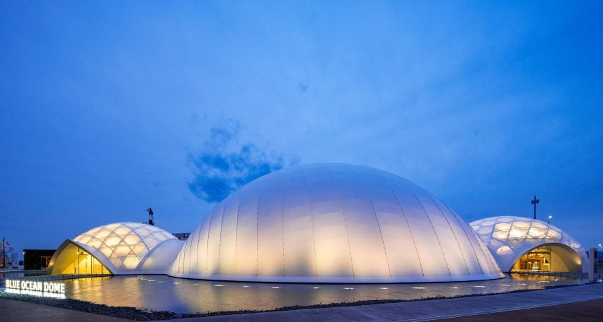 일본 건축가 시게루 반(Shigeru Ban)은 오사카 엑스포 2025(Expo 2025 Osaka)에서 '블루 오션 돔(Blue Ocean Dome)'을 선보였습니다. 그는 이 전시관을 위해 종이 튜브, 적층 대나무, 탄소섬유 강화 플라스틱 튜브 등 다양한 소재를 사용했습니다. 블루 오션 돔은 세계 바다의 가치를 조명하는 전시를 담고 있으며, 위치는 메인 순환 구조물인 그랜드 링(The Grand Ring) 바로 바깥입니다.