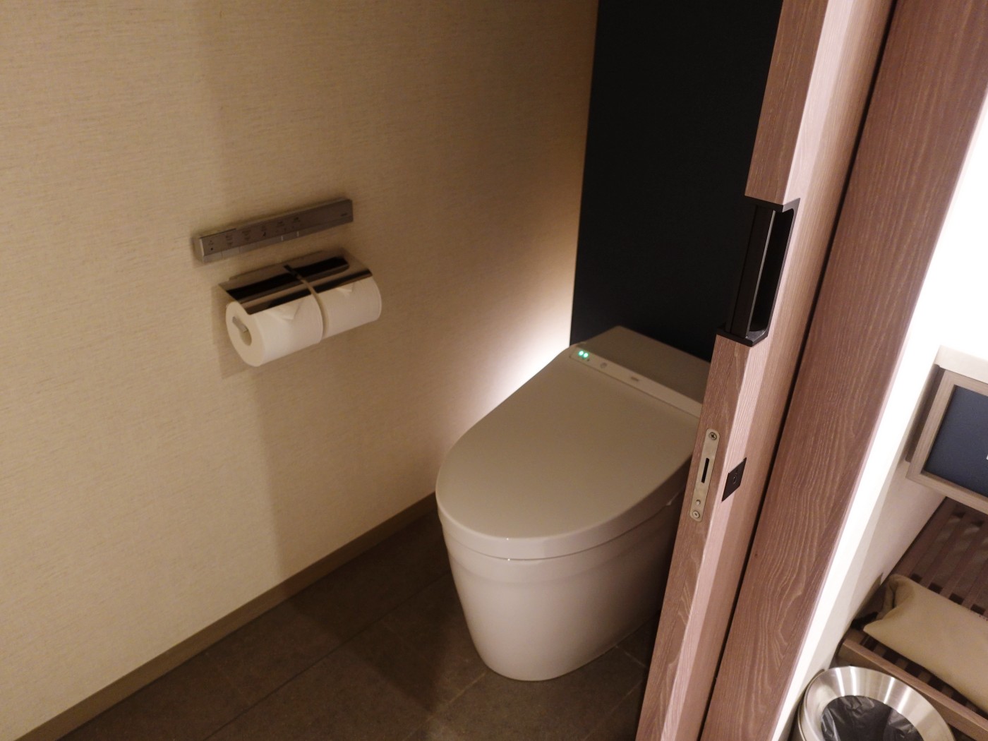 미닫이 문이 설치된 화장실은 비데를 갖추었다.