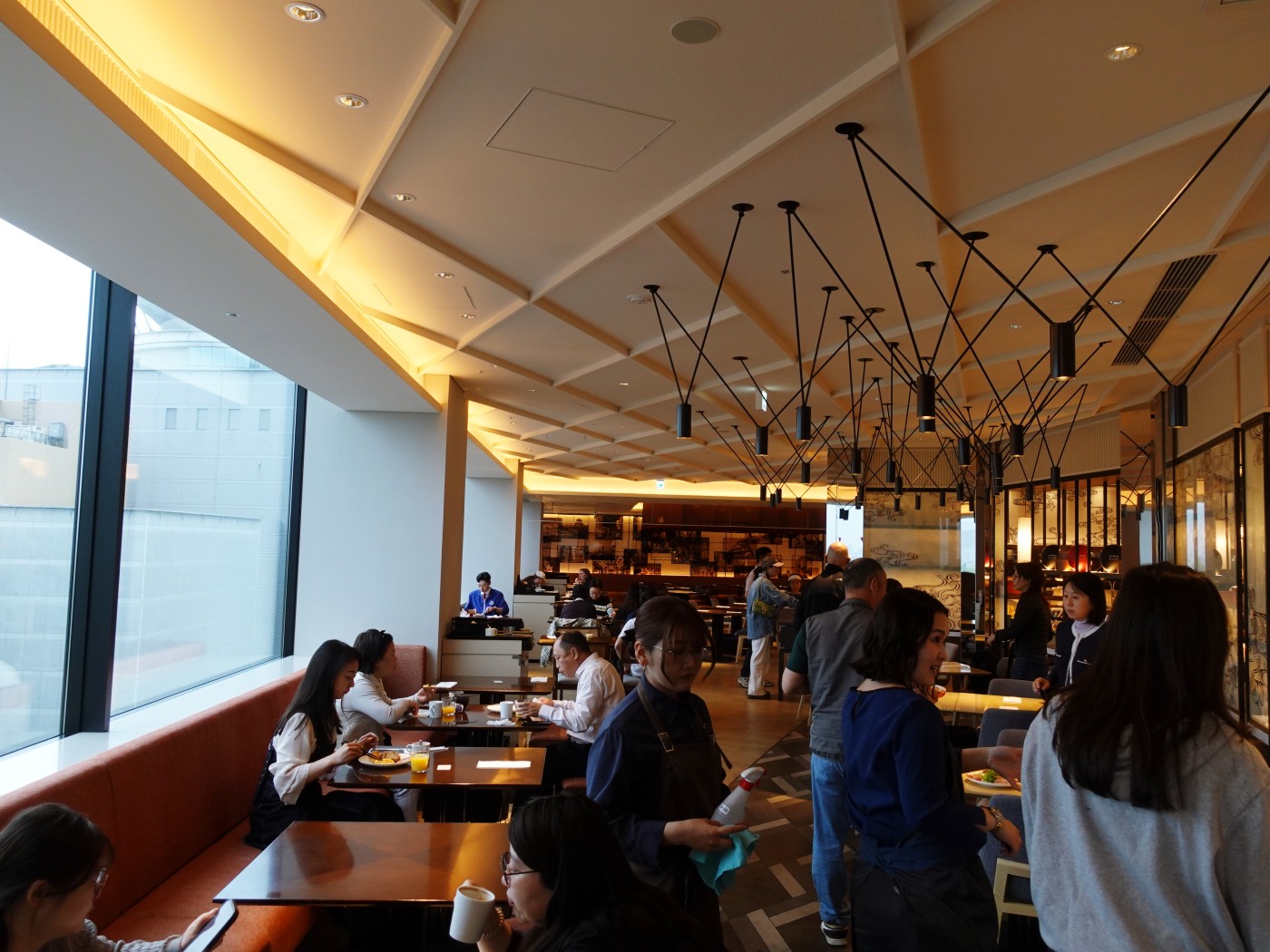 붐비는 조식당에서도 빛나는 오사카 성 뷰.