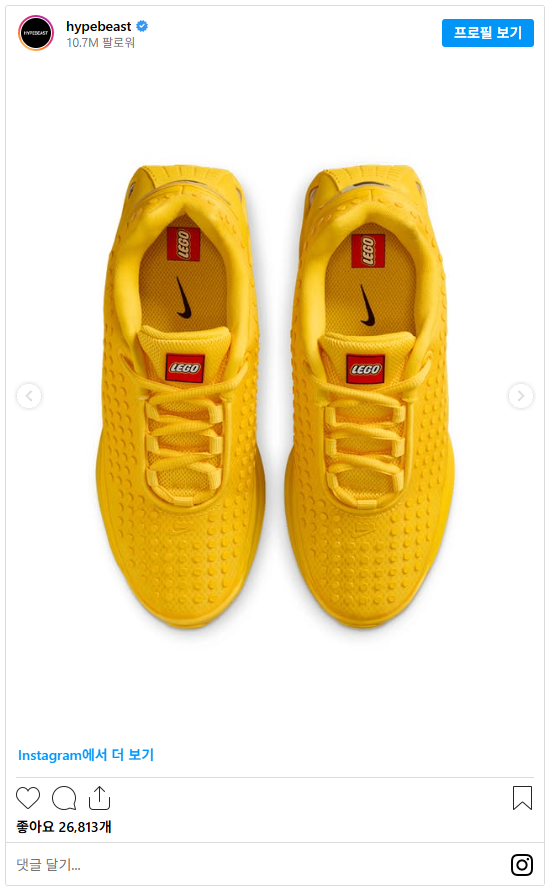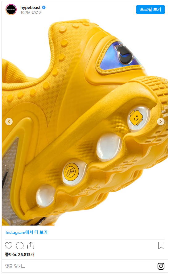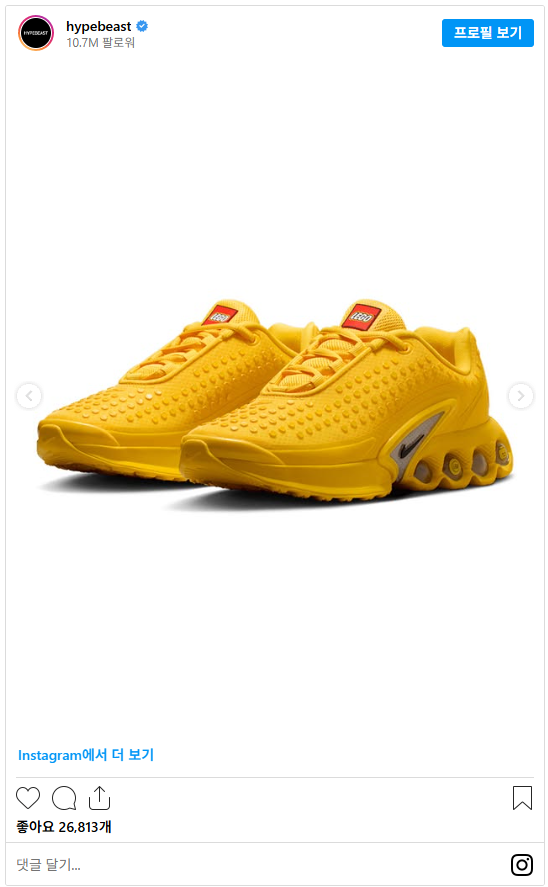 덴마크 완구회사 레고가 이번에는 신발까지 영역을 확장했습니다. 레고는 나이키(Nike)와 협력하여 밝은 레고 옐로우 색상의 어린이용 스니커즈를 발표했습니다. 이번에 공개된 ‘나이키 에어맥스 DN x 레고’는 ‘투어 옐로우’ 컬러웨이로 디자인되었으며, 신발 상단에는 레고 블록 스타일의 돌기가 장착되어 있습니다. 혀 부분에는 레고의 빨간 블록 로고가, 뒤꿈치에는 하이브리드 형태의 나이키-레고 로고가 새겨졌습니다. 이 스니커즈는 7월 출시 예정인 1,180피스짜리 레고 나이키 덩크 세트 이후 8월에 판매될 예정입니다.