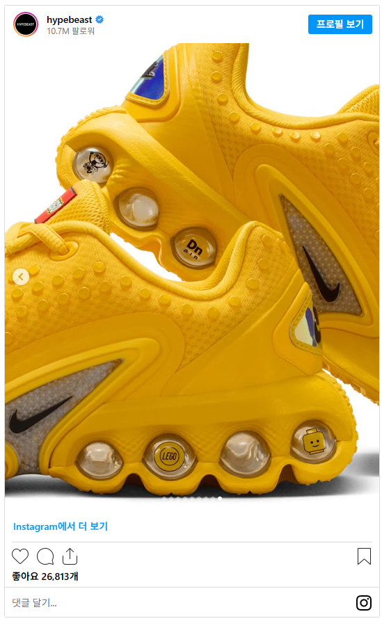 덴마크 완구회사 레고가 이번에는 신발까지 영역을 확장했습니다. 레고는 나이키(Nike)와 협력하여 밝은 레고 옐로우 색상의 어린이용 스니커즈를 발표했습니다. 이번에 공개된 ‘나이키 에어맥스 DN x 레고’는 ‘투어 옐로우’ 컬러웨이로 디자인되었으며, 신발 상단에는 레고 블록 스타일의 돌기가 장착되어 있습니다. 혀 부분에는 레고의 빨간 블록 로고가, 뒤꿈치에는 하이브리드 형태의 나이키-레고 로고가 새겨졌습니다. 이 스니커즈는 7월 출시 예정인 1,180피스짜리 레고 나이키 덩크 세트 이후 8월에 판매될 예정입니다.