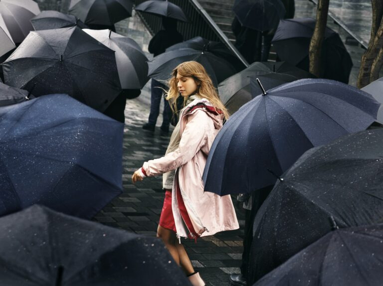 밀리터리 컬러의 재킷과 러버 부츠를 톤온톤으로 매치한 코디는 간결하면서도 엘레강스한 분위기를 자아냅니다. 셔츠와 테이퍼드 팬츠를 함께 입으면 더욱 단정한 스타일이 완성됩니다. 베이지 컬러 재킷으로 포인트를 더하면 캐주얼한 느낌도 낼 수 있습니다. 또 다른 스타일로는 무릎 길이의 레인코트를 활용한 레이어드가 있습니다. 네이비와 핑크 컬러를 겹쳐 입어, 비 오는 날에도 시선을 사로잡는 룩을 연출할 수 있습니다.