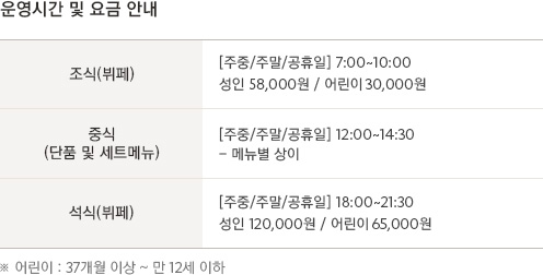 • 운영시간: 조식 08:00 ~ 11:00, 런치 12:00 ~ 17:00, 디너 18:00 ~ 01:00