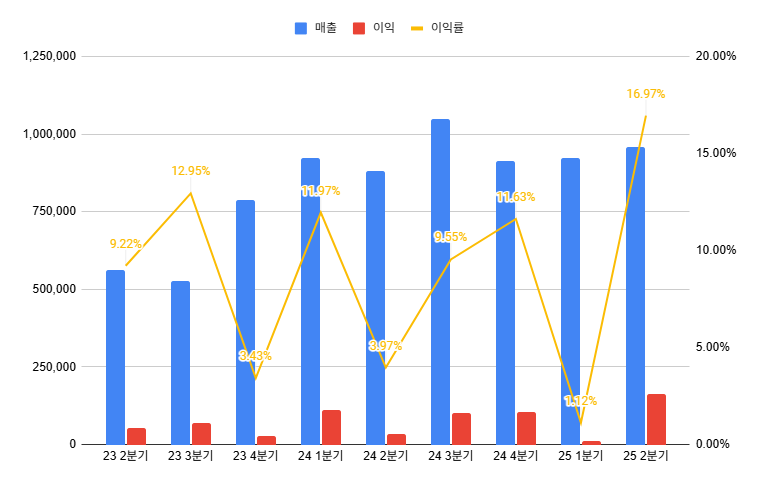 • 2025년 2분기 영업이익률: 16.97%