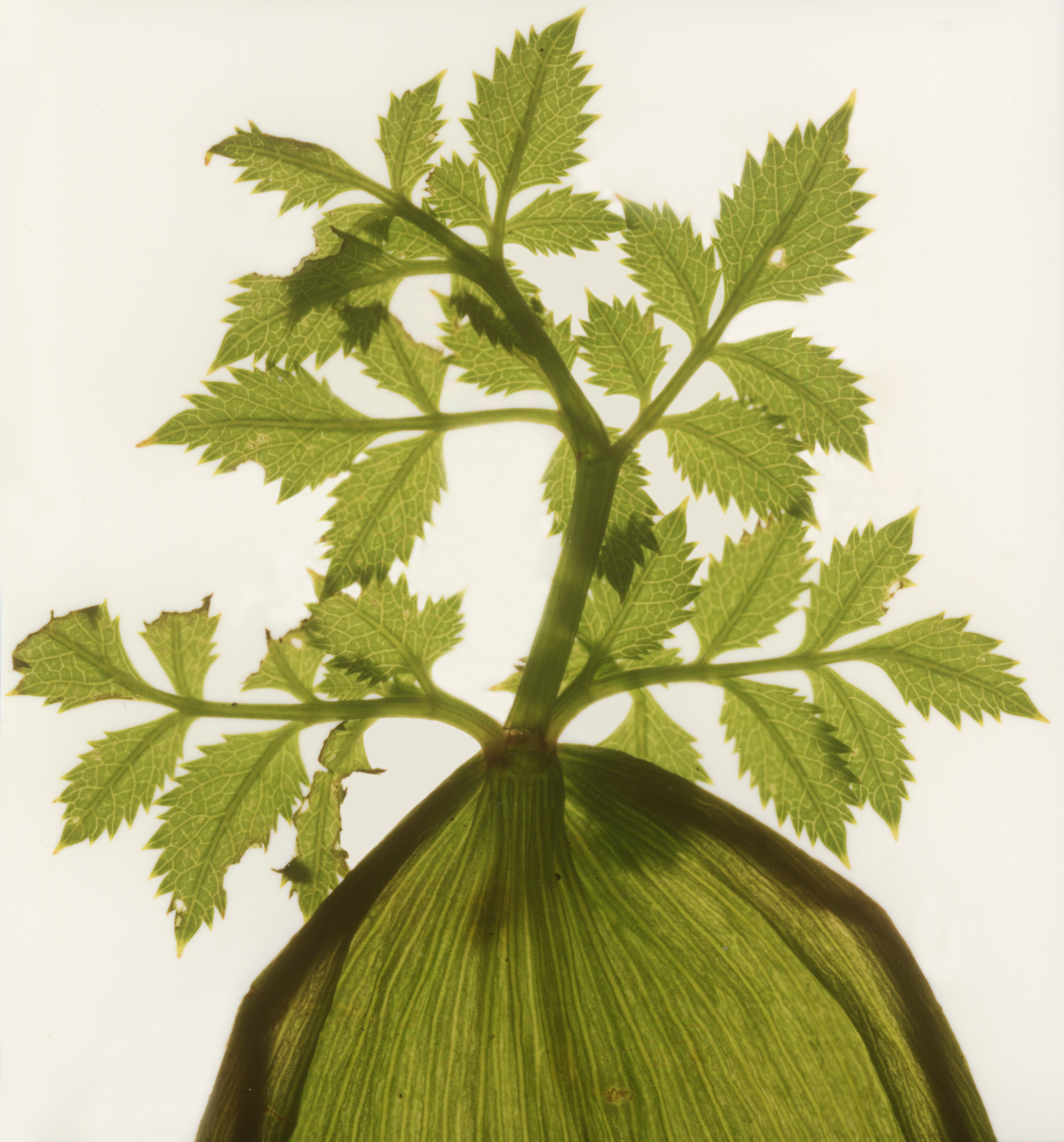 1980년대 중반, 밀러는 사진기를 완전히 버리고 암실에서 작업하는 방식으로 전환합니다. 그는 나뭇잎, 나무 껍질, 색유리, 액체 등 반투명 재료를 이용해 빛을 인화지에 투과시키는 방식으로 추상적인 이미지를 창조해냈습니다. 초기에는 식물을 확대기에 넣어 직접 빛을 투사해 생생한 빛의 잎사귀 이미지를 만들어냈습니다. 이는 19세기 초폭스 탤벗(Fox Talbot)이 식물이나 레이스, 깃털을 직접 감광지에 올려 실루엣을 남겼던 초기 사진 기법을 떠올리게 합니다. 밀러의 작업은 그러한 시각적 경이감을 현대적 감각으로 재해석한 결과라 할 수 있습니다.