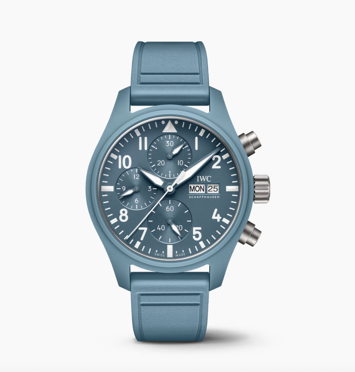 IWC의 '파일럿 워치 크로노그래프 41 탑건 미라마(Pilot’s Watch Chronograph 41 Top Gun Miramar)'는 하늘과 바다 사이의 절묘한 블루톤으로 여름 감성을 자극한다. 팬톤(Pantone®)과 공동 개발한 41.9mm 세라믹 케이스는 스틸보다 가볍고 흠집에도 강하다. 건축적인 매트 마감과 정밀한 프린트가 돋보이는 다이얼 속에는 46시간 파워리저브의 칼리버 69380 무브먼트가 탑재되어 있다. 탑건 감성과 기능성이 절묘하게 조화를 이루는 이 모델은 £11,100(약 1,920만 원)에 판매된다.