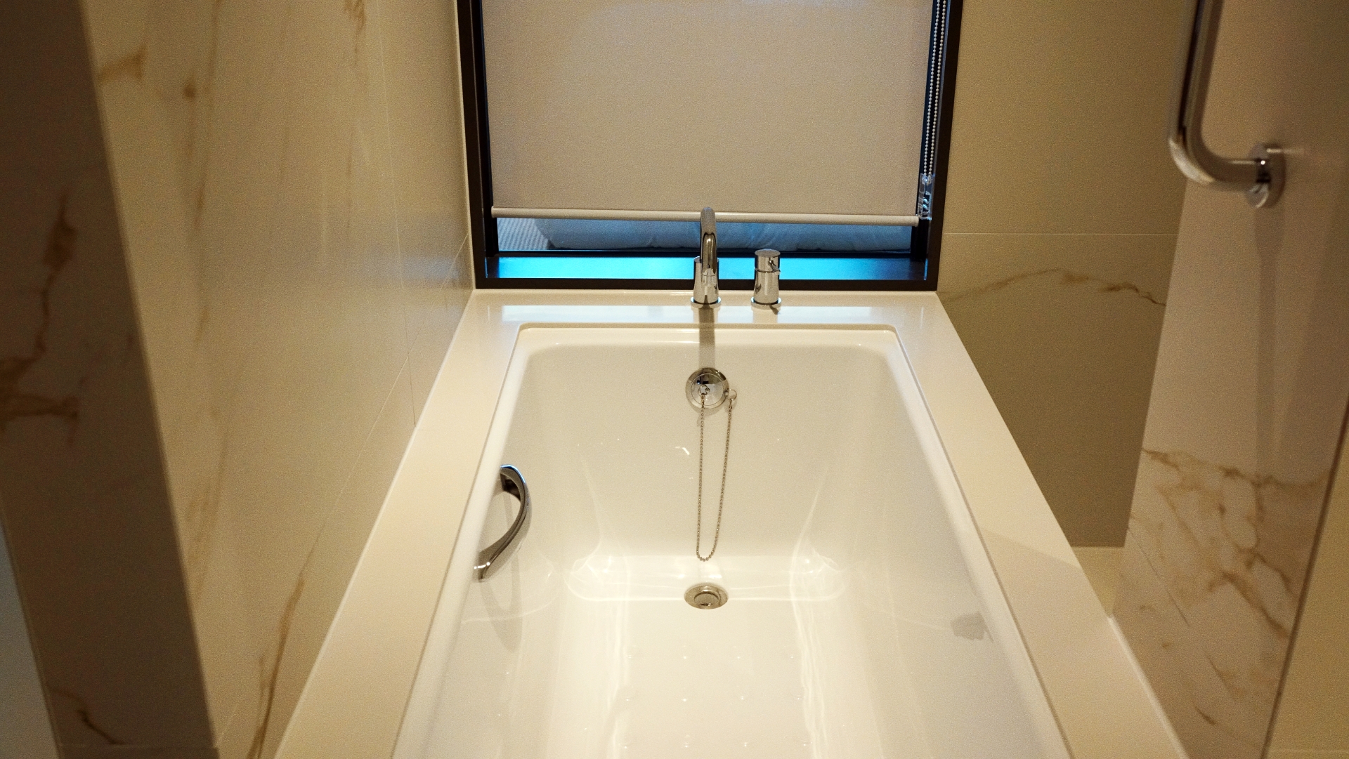 욕조가 독특하게 샤워부스와 세면대를 가로질러 배치되었다.