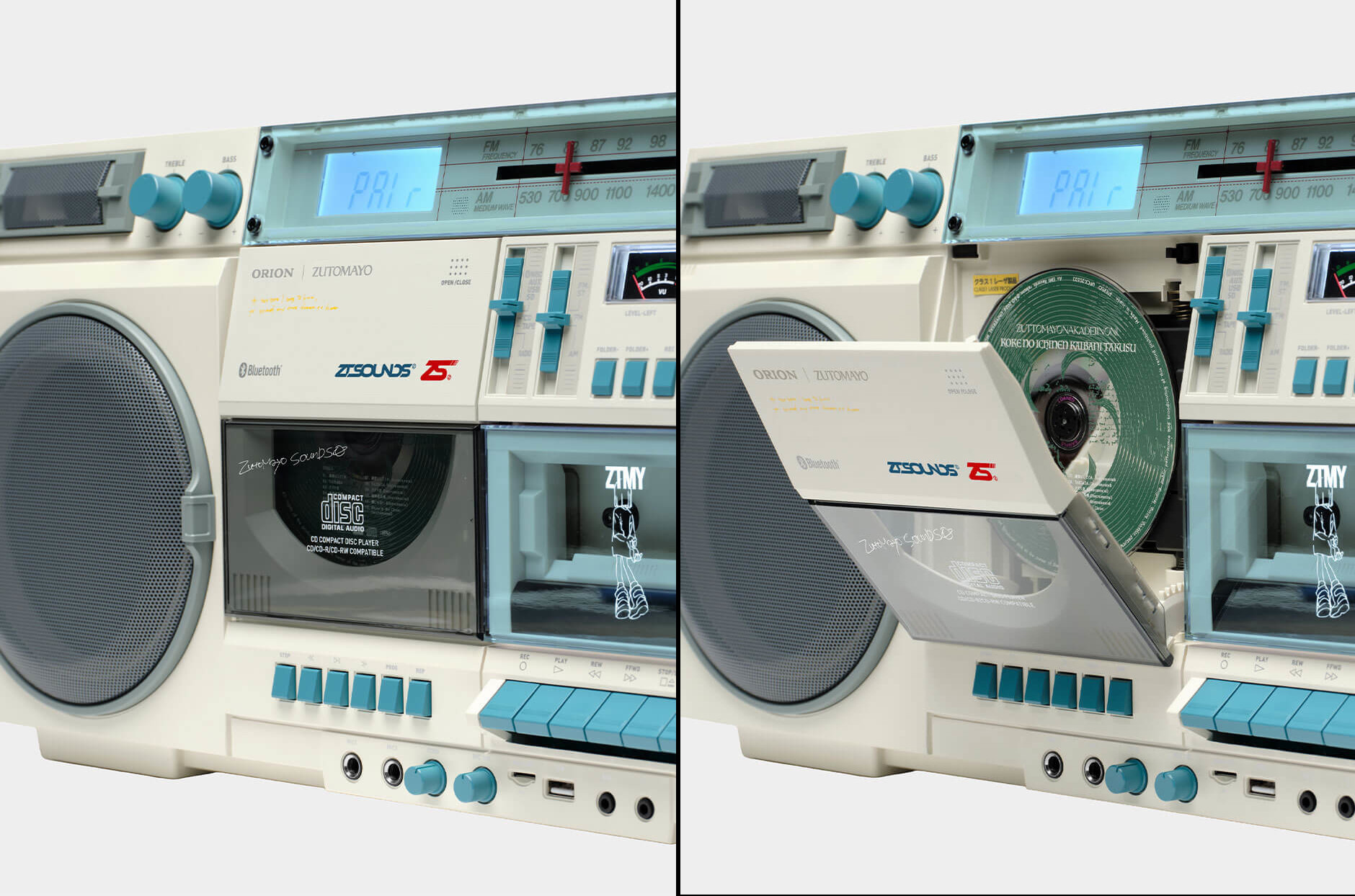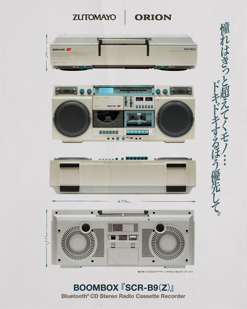 컬트적인 인기를 얻고 있는 일본 밴드 즈토마요(Zutomayo)가 전자 브랜드 오리온(Orion)과 협업해 특별판 붐박스 SCR-B9(Z)를 공개했습니다. 이 모델은 1980년대 오디오 기기의 향수를 불러일으키면서도 오늘날의 다양한 포맷을 소화할 수 있도록 설계되었습니다. 기본형 올블랙 SCR-B9에서 한 단계 나아가 크림과 인더스트리얼 그린 색상을 조합해 시각적 차별화를 더했습니다. 밴드 로고와 그래픽도 적용되어 소장 가치를 높였습니다.