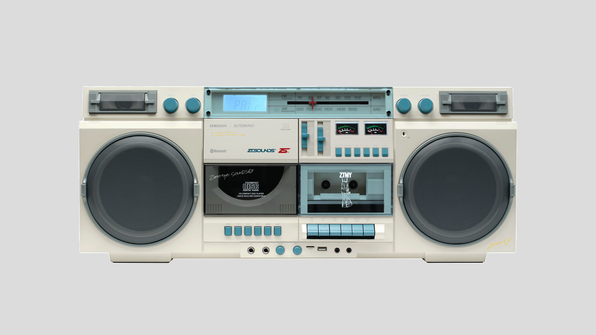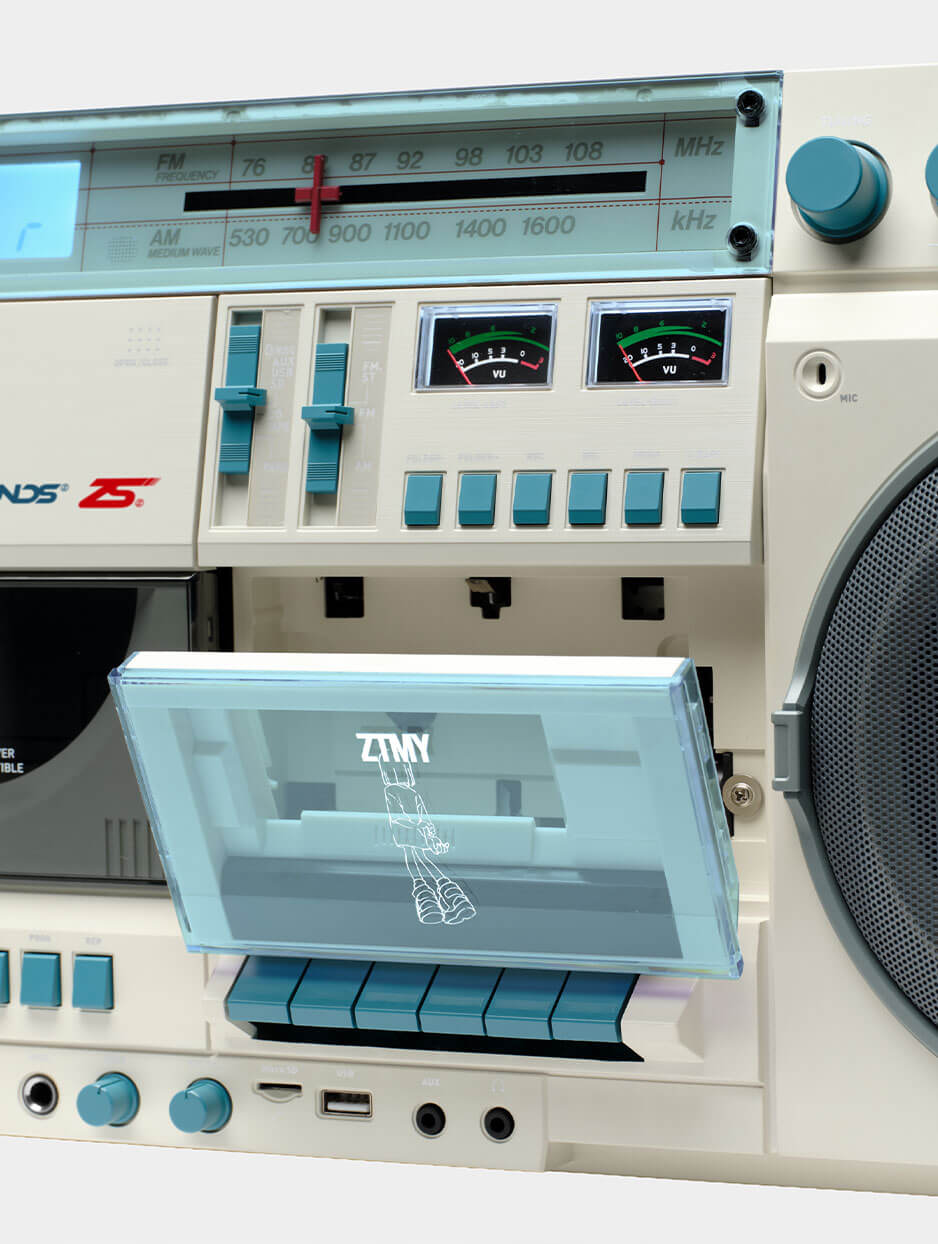 제품 외관은 LCD 디스플레이, 볼륨과 기능을 조절하는 노브와 슬라이더, 기계식 카세트 버튼, 전통적인 VU 미터 등 클래식한 붐박스의 감성을 충실히 재현했습니다. 13.5cm 우퍼와 3cm 트위터가 탑재돼 강력한 스테레오 출력을 제공하며, 베이스 강화 기능으로 저음을 보강할 수 있습니다. CD 플레이어는 MP3 파일 재생도 지원해 다양한 음원을 소화합니다.