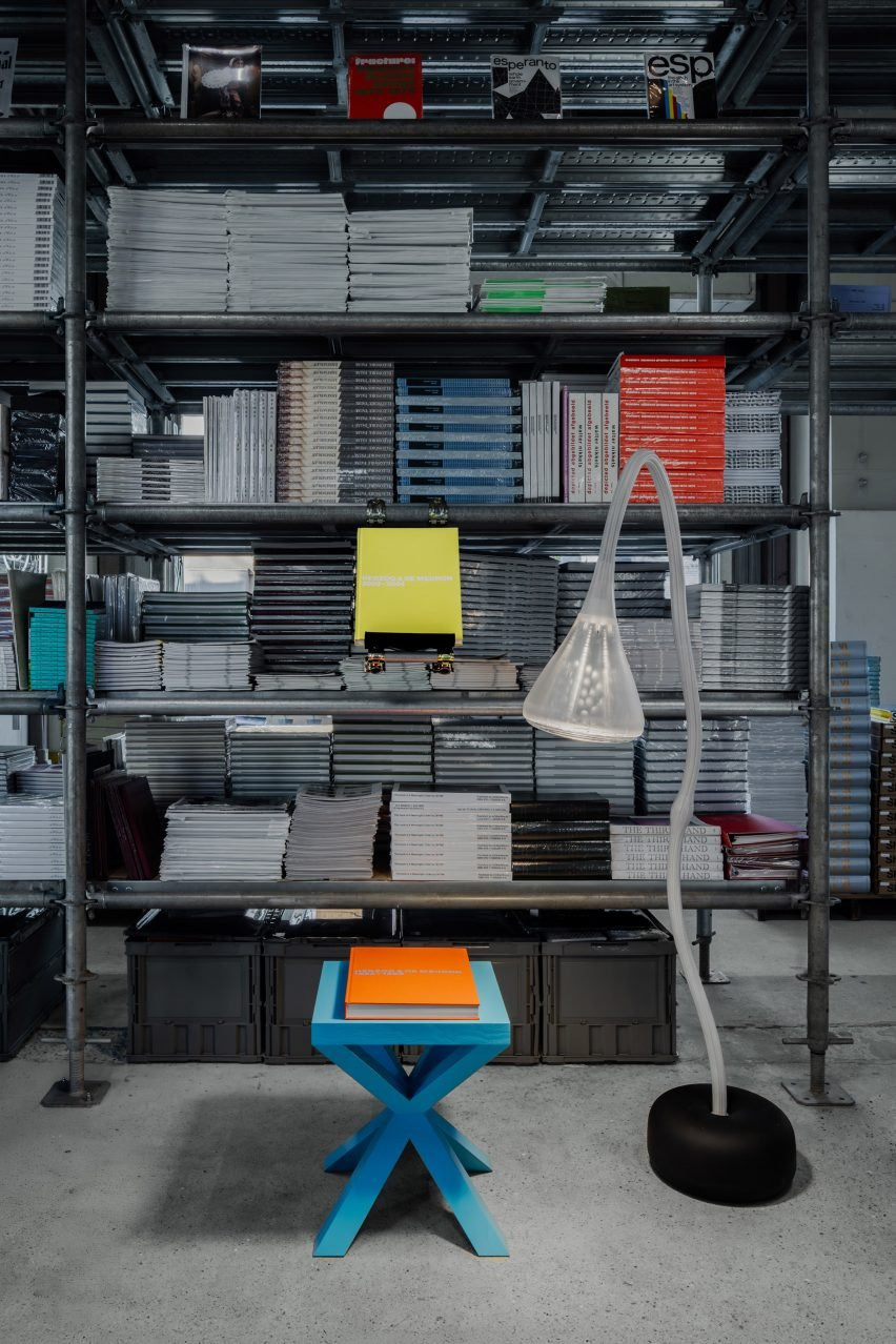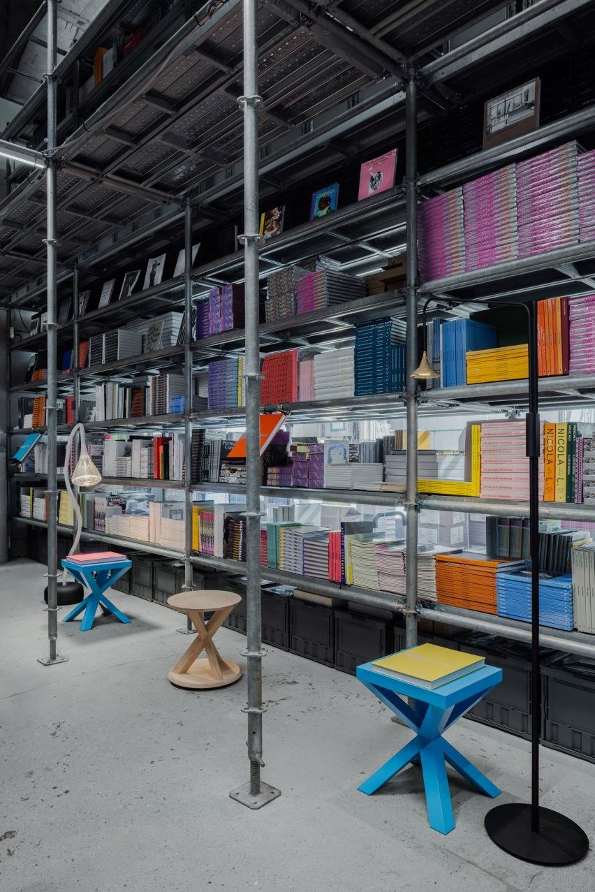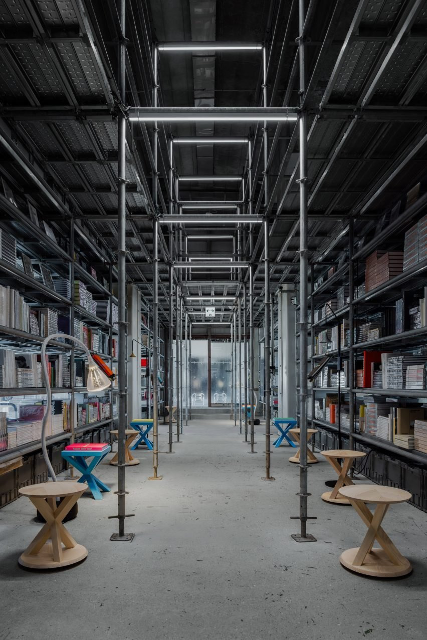 이번 전시의 중심은 스튜디오가 직접 디자인한 목재 스툴 ‘엑스-로커(X-Rocker)’와 ‘엑스-호커(X-Hocker)’입니다. 이 스툴들은 비계 형태의 책장 구조 안에 배치되어, 마치 작은 서재처럼 여섯 개의 독립된 독서 공간을 형성했습니다. 헤르조그 & 드 뫼롱은 “책장 안에 친밀한 여섯 개의 독서 공간을 만들고, 우리의 가구와 조명을 배치해 관람객이 앉아 책을 읽을 수 있도록 구성했다”고 설명했습니다. 스툴은 사용하지 않을 때는 조형적 오브제로 기능하며, 공간의 미감을 완성하는 요소로 자리합니다.