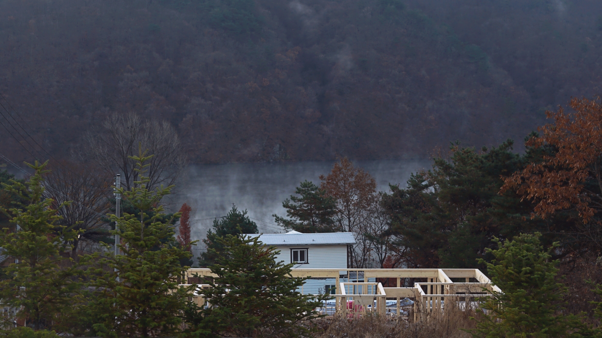 멀리 보이는 북한강 위로 수증기가 가득하다.