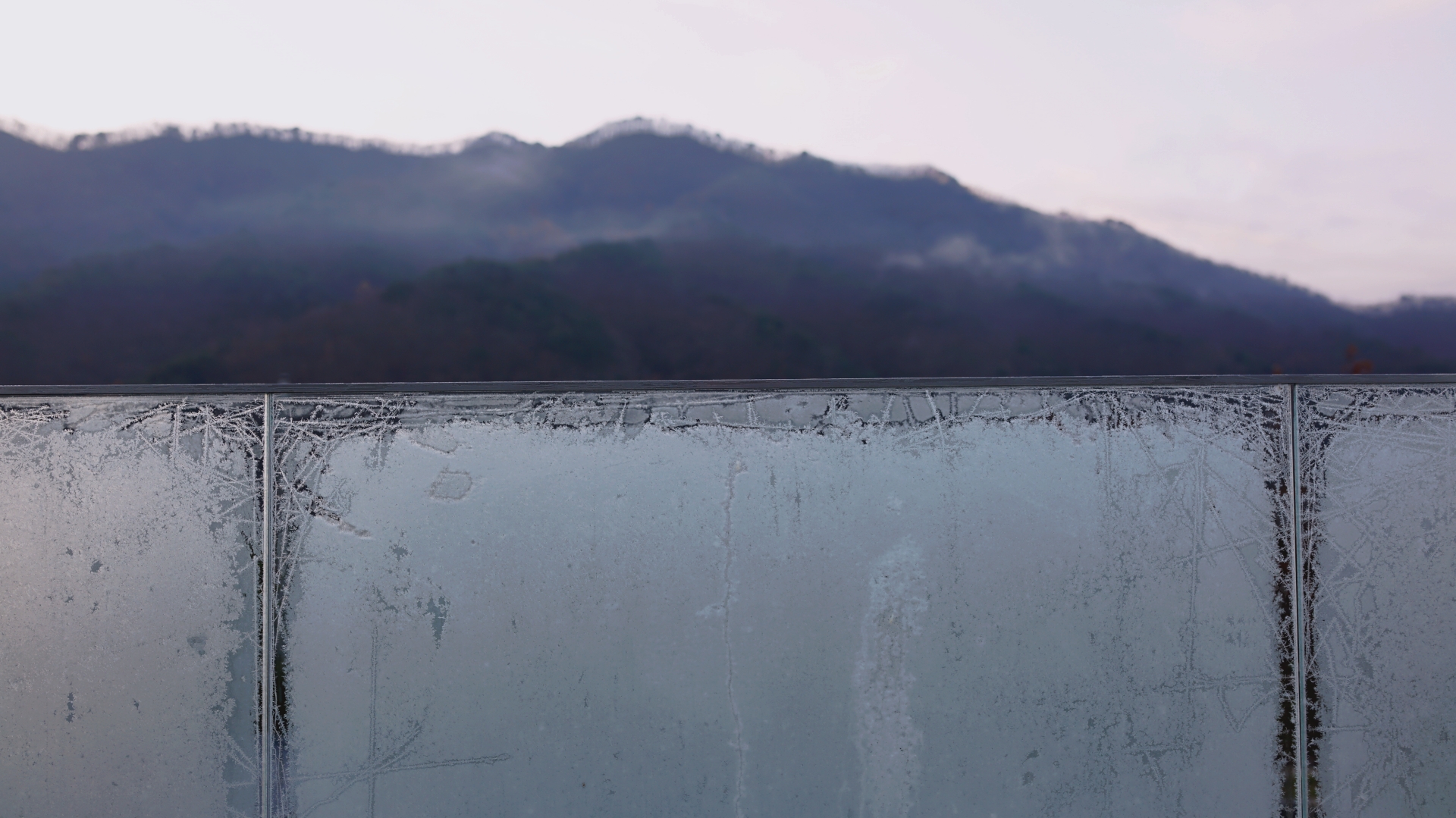 아웃도어 데크 유리 난간에는 성애가 끼고,