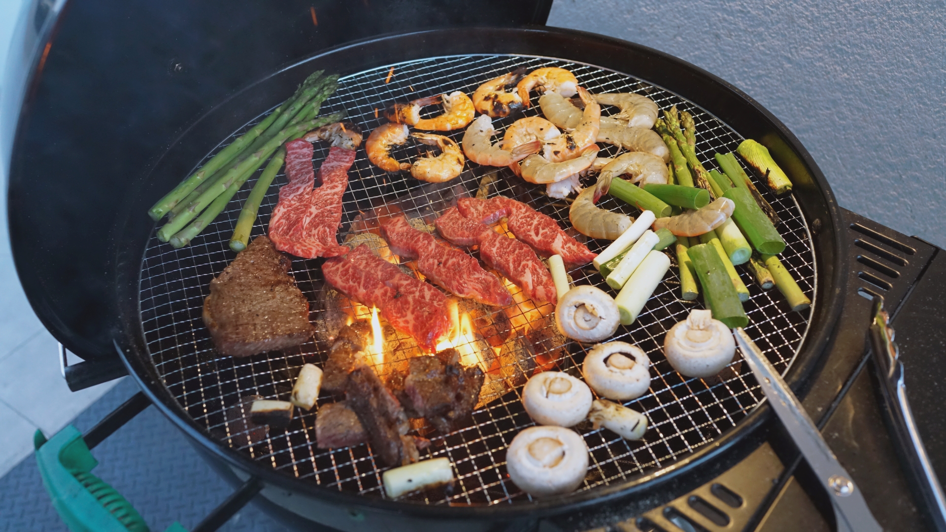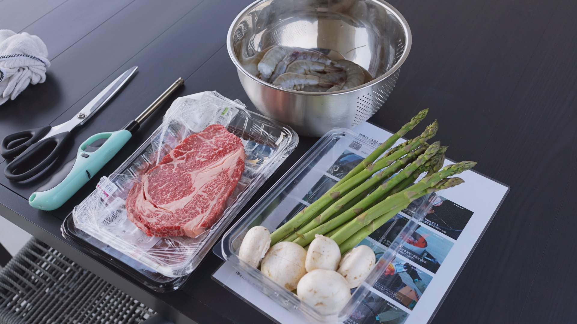 오늘 바베큐 메뉴는 한우등심, 갈빗살과