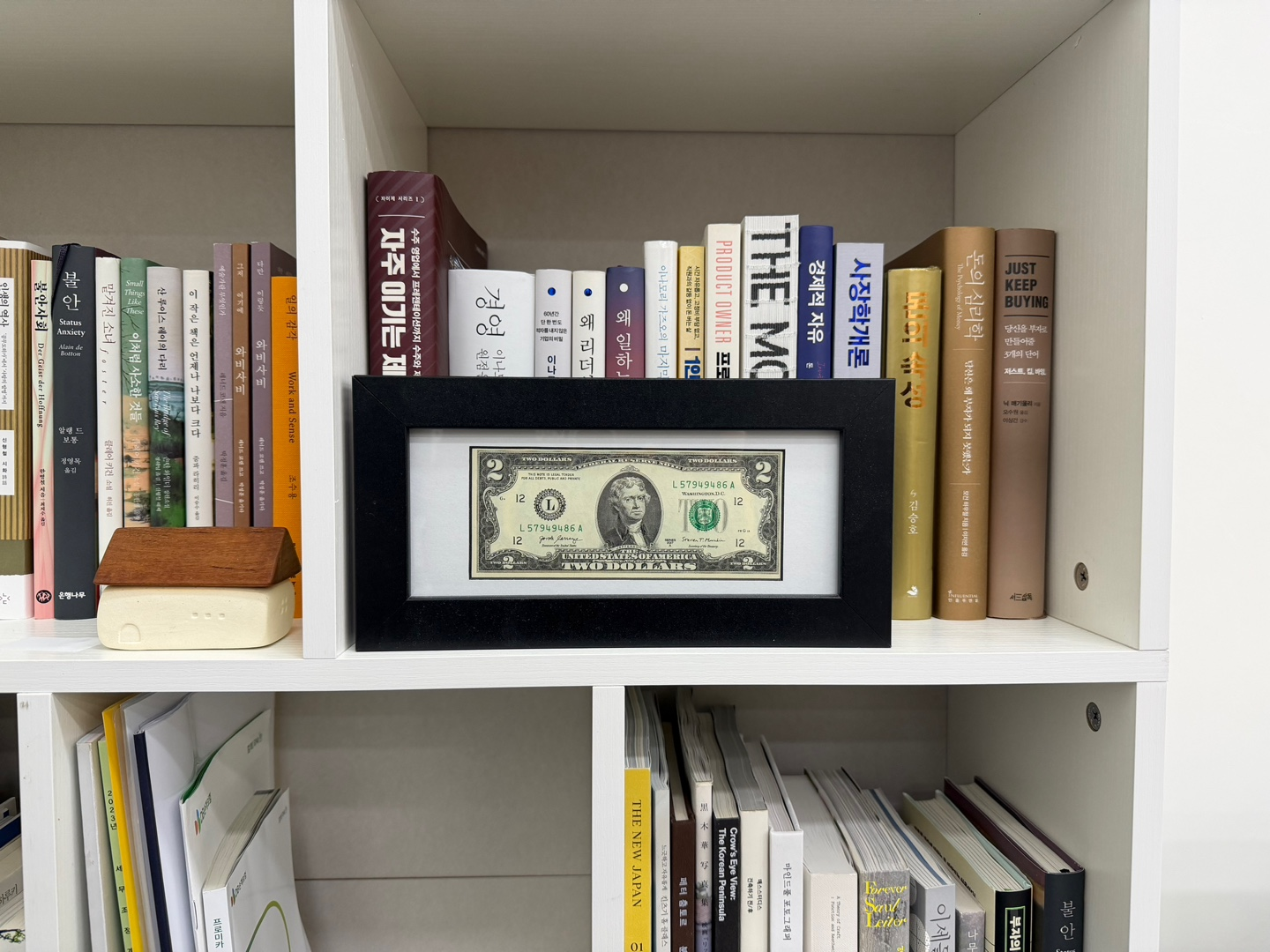 이번 분기에 소개할 사무실 풍경은 책장에 진열된 2달러 지폐다. 이는 에어비앤비를 운영하며 게스트로 받은 팁이다. 처음 받은 팁에 당황하고 왜 2달러인가 싶어서 2달러 팁에 대한 정보를 찾아 보았다. 2달러 지폐는 보기 드물기 때문에 미국인들은 이를 행운의 상징으로 여긴다고 한다. 그래서 지갑 속에 넣어 두면 돈이 잘 들어온다, 중요한 날에 지니고 있으면 운이 트인다, 경마장에서 2달러 지폐로 첫 배팅을 하면 좋은 결과가 있다는 등의 속설이 있다고 한다. 그래서 누군가는 가족이나 친구에게 2달러 지폐를 선물하며 행운을 빌어 준다고 한다.