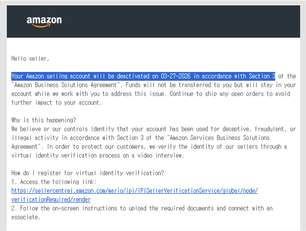 계정 비활성화의 근거인 섹션 3 공지를 뜯어보니 마음이 더 복잡해진다. 아마존이 내 계정에서 기만적이거나 사기적인 활동이 감지되었다고 주장하는데, 아마도 첫 입고를 앞두고 제출한 상품 공급처 소명 자료가 그들의 까다로운 기준을 충족하지 못한 것 같다. 인보이스 상의 서류 미비나 공급망의 투명성을 의심받은 것은 아닐지 이런저런 불길한 예상이 머릿속을 떠나지 않는다. 정당하게 물건을 준비 중인데 시스템에 의해 '부정 판매자' 취급을 받는 현실이 너무 억울하고 답답하다.