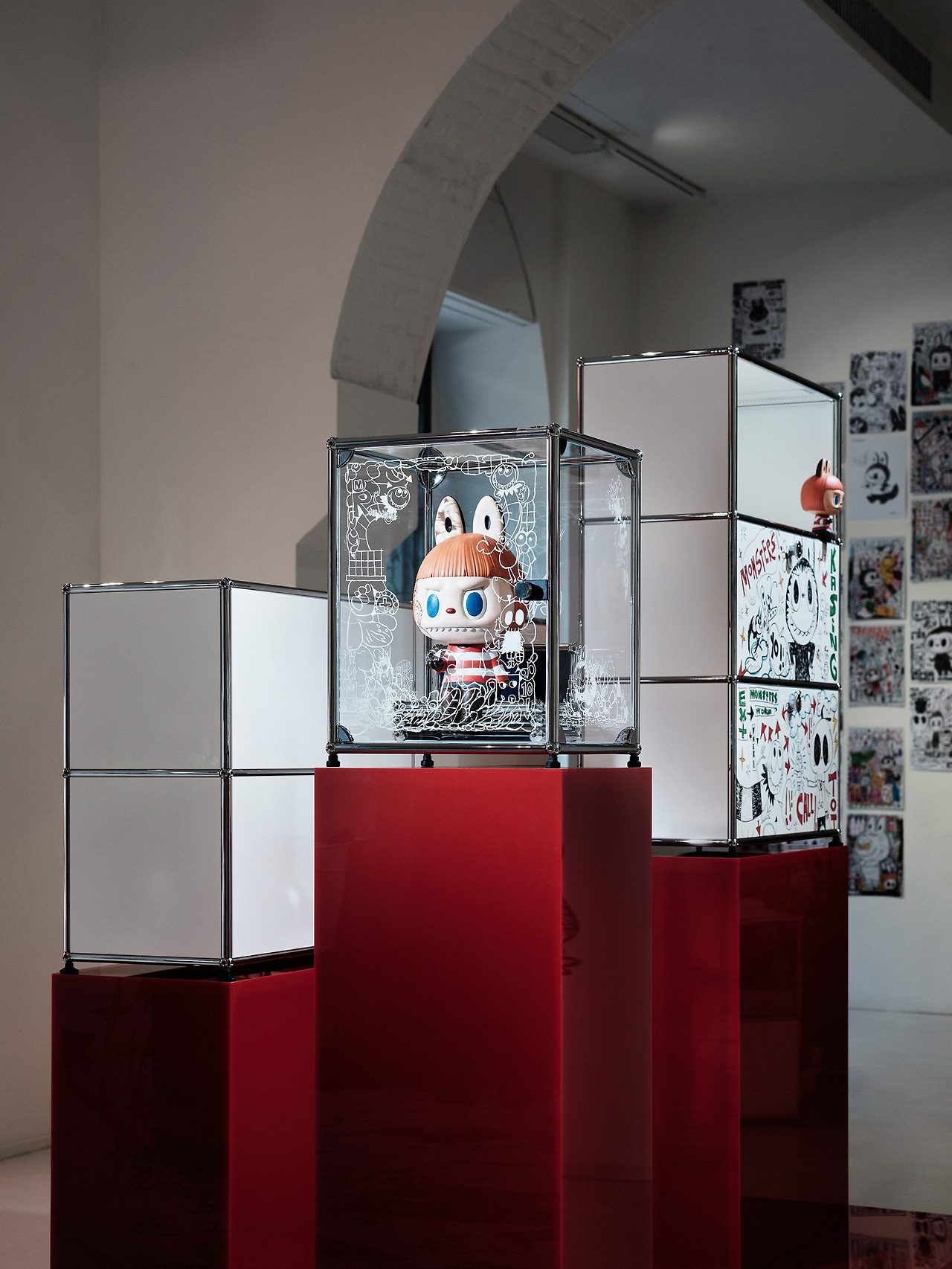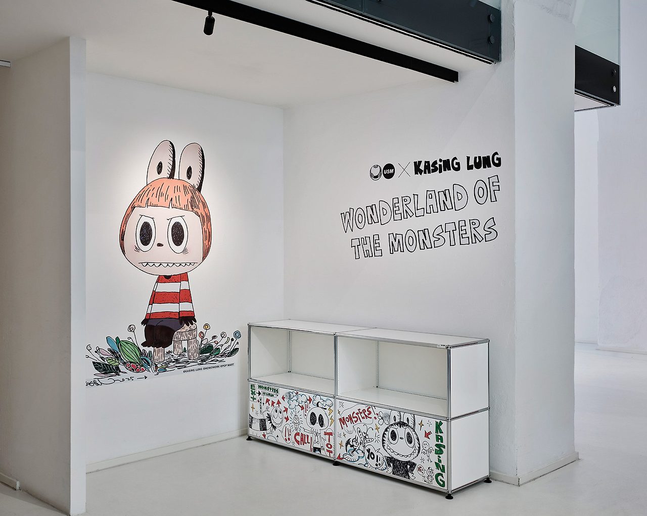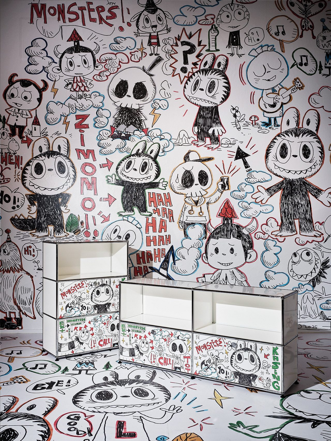 카싱 룽의 첫 번째 가구 협업인 이번 컬렉션은 USM 할러의 대표 모델인 사이드보드와 선반 유닛으로 구성되어 있습니다. 깔끔한 화이트 패널 전면에는 라부부를 비롯한 '더 몬스터즈(The Monsters)' 유니버스의 개성 넘치는 캐릭터들이 정교하게 프린트되어 있습니다. 뾰족한 이빨을 가진 장난스러운 괴물 캐릭터들은 미니멀한 디자인의 대명사인 USM 시스템에 역동적인 에너지를 불어넣으며 가구를 하나의 거대한 캔버스로 변모시켰습니다.