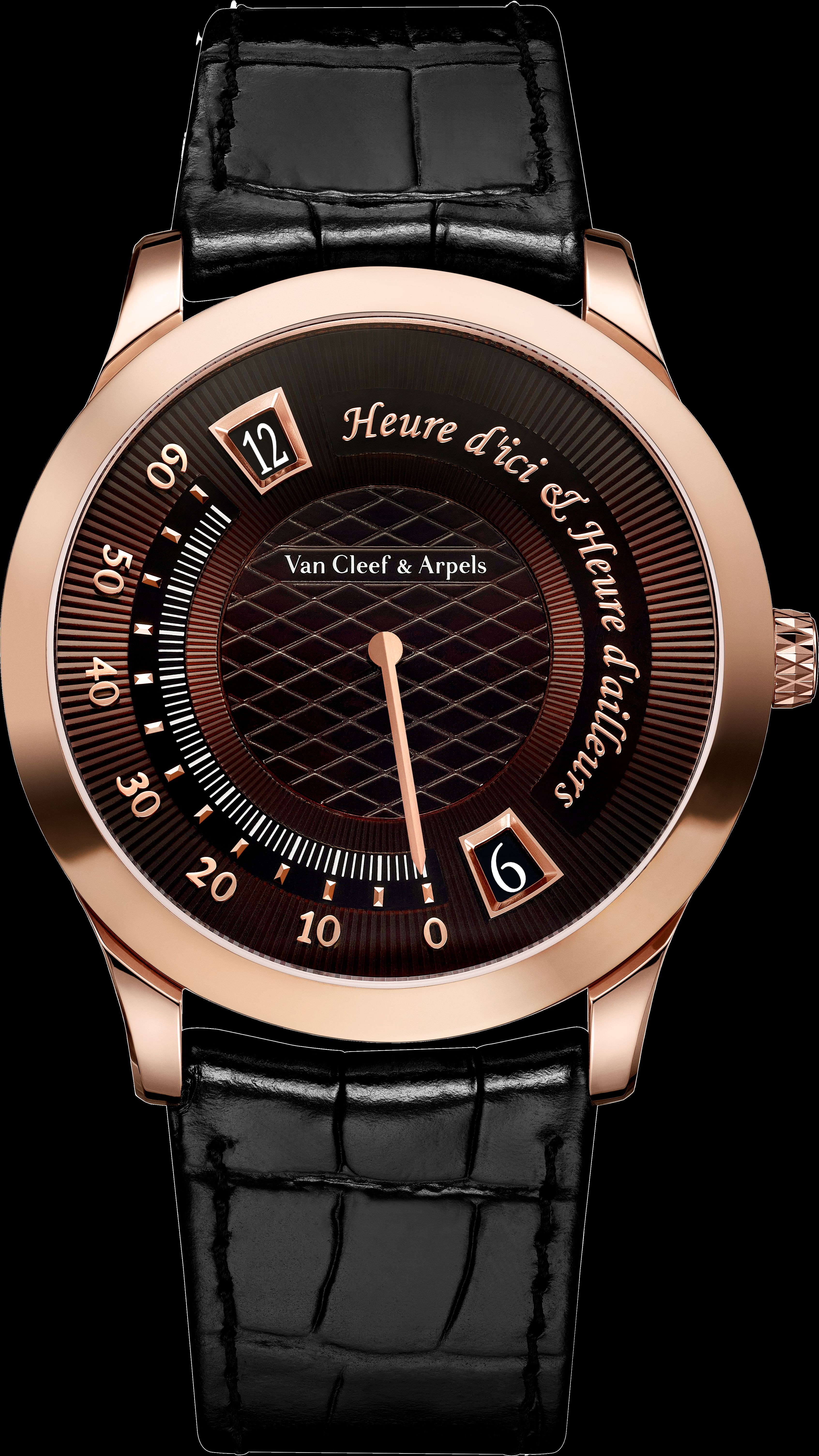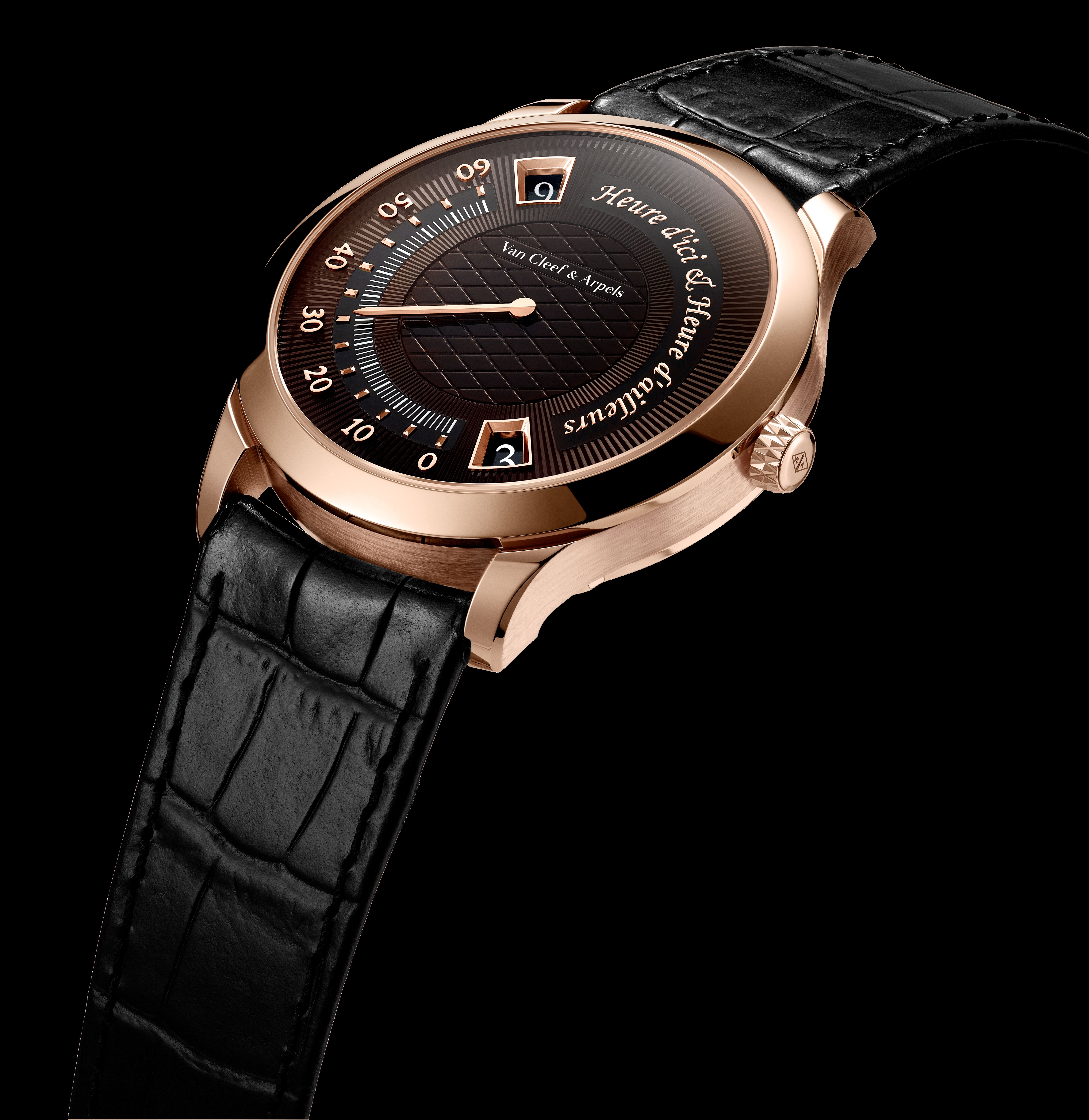 미드나잇 유르 디시 에 유르 다이요르(Midnight Heure d’ici & Heure d’ailleurs)는 하늘에서 시선을 돌려 지구상의 두 지점 사이의 시간을 연결합니다. 38mm 로즈 골드 케이스에 탑재된 새로운 자동 무브먼트는 65시간의 파워 리저브를 제공합니다. 상단 창에는 ‘현지 시간’을, 하단 창에는 ‘타 지역 시간’을 표시하며, 중앙의 레트로그레이드 분침과 완벽하게 동기화되어 작동합니다.